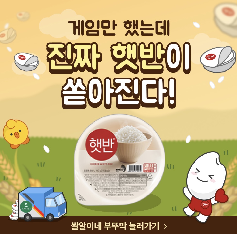 햇반 캐릭터인 쌀알이를 키우면 실제 햇반을 보내주는 게임인데요,