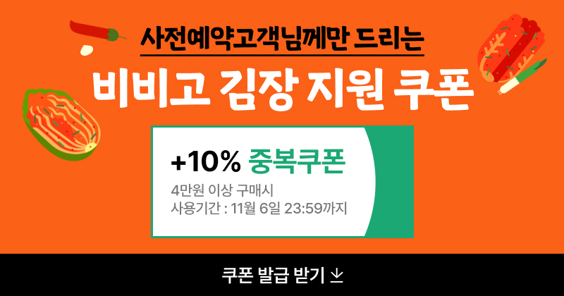 사전예약가에 10% 비비고 김장 지원 중복 쿠폰 까지 더블 할인 적용 가능하다고 해요~!