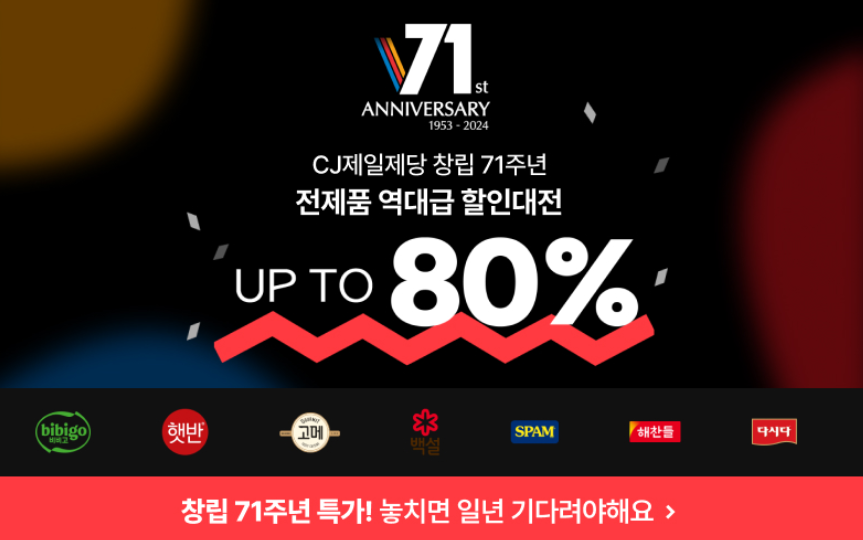 며칠 전 CJ더마켓에서 직접 구매하면서 깜짝 놀란 특가 혜택을 여러분과 공유하려고 합니다. 71주년을 맞이한 CJ더마켓에서 역대급 할인 행사를 진행 중인데요, 최대 80% 할인에 중복 할인까지 가능한 특별한 기회를 놓치지 마세요.